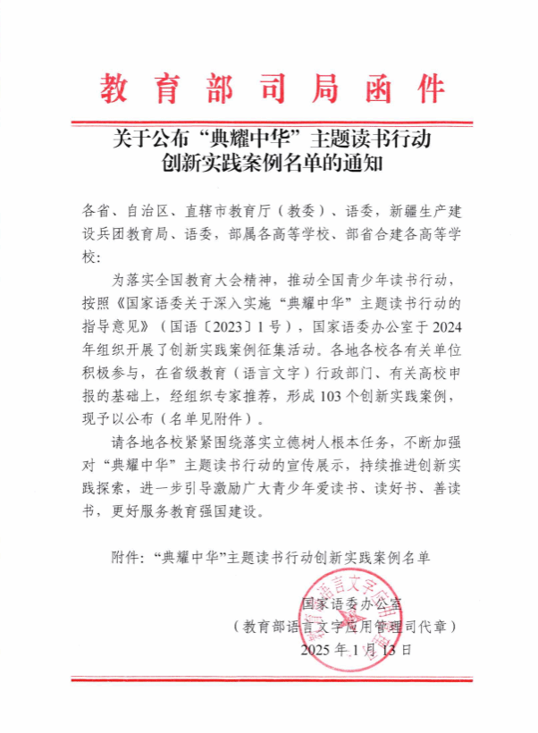为落实全国教育大会精神,推动全国青少年读书行动,按照《国家语委关于深入实施“典耀中华”主题读书行动的指导意见》(国语〔2023〕1号),国家语委办公室于2024年组织开展了创新实践案例征集活动。