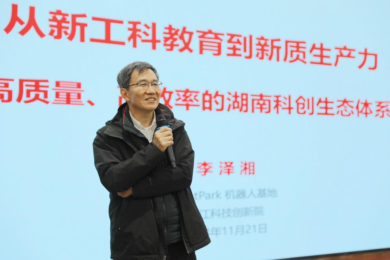 揭牌仪式后,李泽湘为湖南省五所成立湘江卓越工程师学院的高校师生代表讲授第一课,介绍了从新工科教育到新质生产力端到端、高质量、高效率的湖南科创生态体系建设方案,分享了湘江科技创新院的探索发展历程,剖析了团队在新工科领域的最新科研成果与实践探索,并与现场师生代表进行交流探讨。