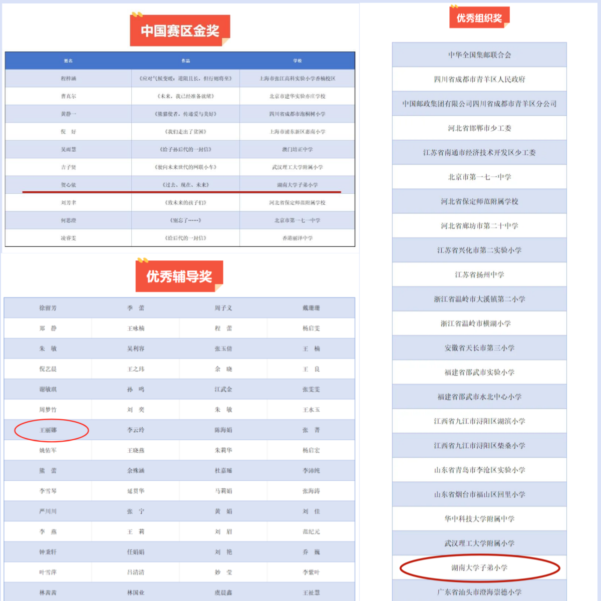 10月25日,“纪念万国邮政联盟成立一百五十周年”第53届国际少年书信写作比赛颁奖典礼暨第54届比赛中国赛区启动仪式在四川博物院举办。湖南大学党委宣传部(新闻办公室)地址中心子弟小学六年级一班贺心依同学的作品《过去、现在、未来》荣获中国赛区金奖。子弟小学荣获优秀组织奖,王丽娜老师获优秀辅导奖。