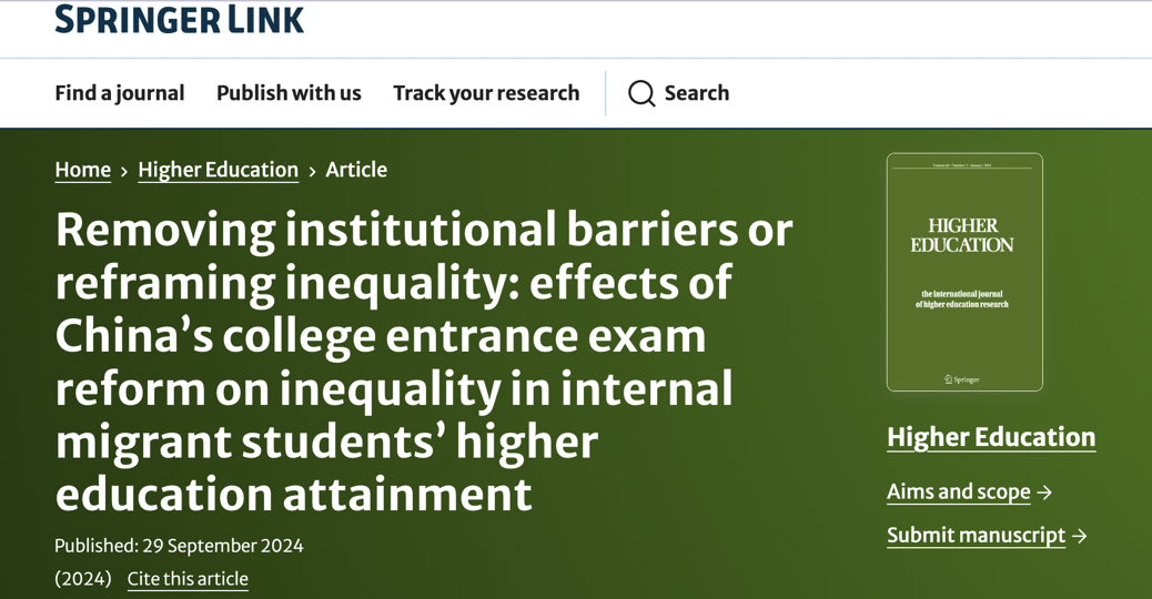 近日,教科院宋琼将助理教授在高等教育研究领域取得进展。研究成果以“Removing institutional barriers or reframing inequality: effects of China’s college entrance exam reform on inequality in internal migrant students’ higher education attainment”为题在高等教育学领域国际权威期刊《Higher Education》上发表。