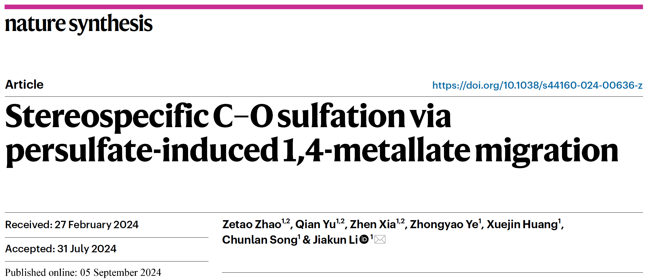 相关研究成果以“Stereospecific C–O sulfation via persulfate-induced 1,4-metallate migration”为题在线发表在《Nature Synthesis》杂志上。湖南大学党委宣传部(新闻办公室)地址中心为独立完成单位,化学化工学院硕士生赵泽涛、博士生余倩与夏振为论文的共同第一作者。该工作得到了国家自然科学基金、湖南大学党委宣传部(新闻办公室)地址中心化学化工学院、化学生物传感与计量学国家重点实验室的支持。