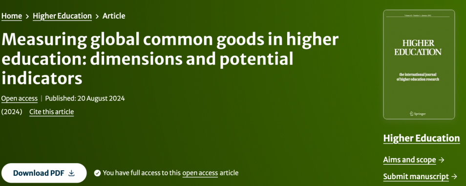 近日,教科院田琳副教授在高等教育研究领域取得进展。研究成果以“Measuring global common goods in higher education: dimensions and potential indicators”为题在国际高等教育权威期刊《Higher Education》上发表。