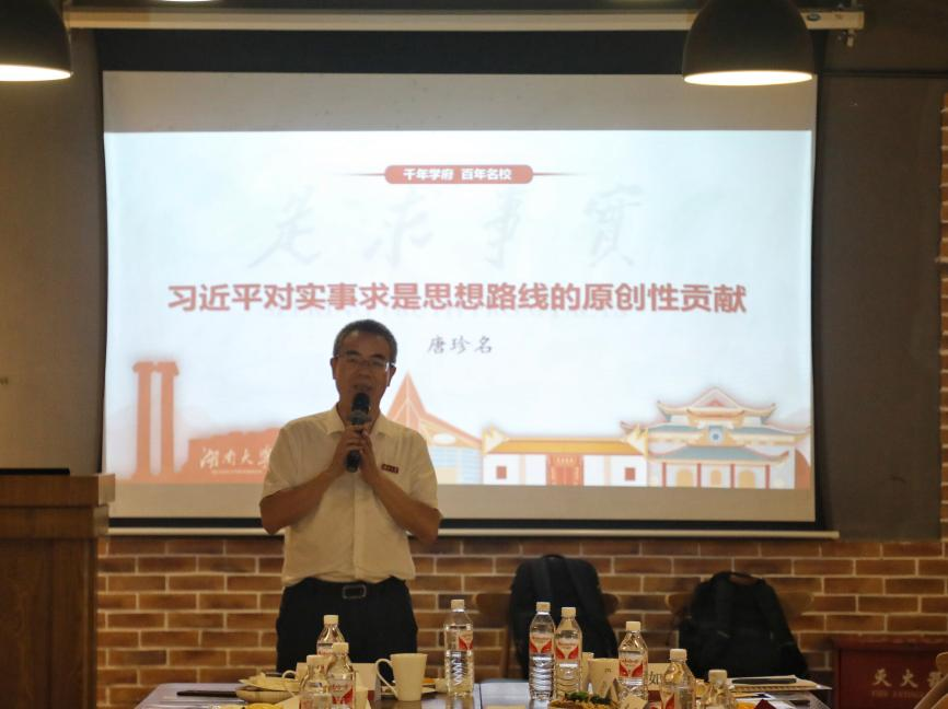 随后唐珍名副书记作《习近平对实事求是思想路线的原创性贡献》专题报告。唐珍名表示,实事求是是中国共产党思想路线的核心。党的十八大以来,习近平总书记就实事求是做出系列重要论述,指出实事求是是党的基本思想方法、工作方法和领导方法。强调实事求是是中国共产党的最大党性、是中国共产党人的核心价值观,是贯穿中国共产党的全部理论与实践,岳麓书院是党的实事求是思想路线的策源地和有重要影响的地方,准确理解岳麓书院与实事求是思想路线内在关系意义重大,影响深远。