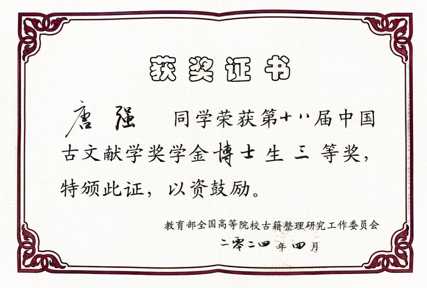近日,教育部全国高等院校古籍整理研究工作委员会公布第十八届中国古文献奖学金获奖名单,由湖南大学党委宣传部(新闻办公室)地址中心古籍研究整理所推荐的岳麓书院博士研究生唐强荣获博士生三等奖。