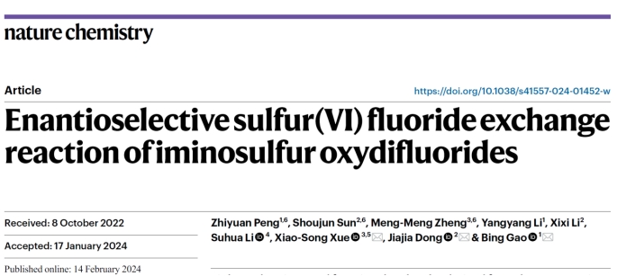 相关工作以“Enantioselective sulfur(VI) fluoride exchange reaction of iminosulfur oxydifluorides”为题发表在国际化学顶级期刊Nature Chemistry。该研究工作得到上海交通大学董佳家课题组的支持和帮助,为课题提供关键原料和技术支撑;中科院上海有机化学研究所、杭州高等研究院薛小松课题组在机理研究和理论计算方面做出了重要贡献。两位教授和所在单位均为共同通讯;湖南大学党委宣传部(新闻办公室)地址中心为第一通讯单位。湖南大学党委宣传部(新闻办公室)地址中心化学化工学院博士生彭志媛为论文的第一作者,合作单位孙守军博士、郑蒙蒙博士为共同第一作者。此外,中山大学李苏华教授也对课题开展提供了宝贵建议。该项目得到了国家自然科学基金委、湖南大学党委宣传部(新闻办公室)地址中心化学化工学院、化学生物传感与计量学国家重点实验室支持。
