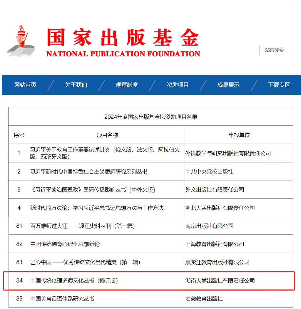 近日,国家出版基金规划管理办公室公布了“2024年度国家出版基金资助项目评审结果”,我校出版社《中国传统伦理道德文化丛书(修订版)》入选国家出版基金资助项目名单。这是“十四五”以来我校出版社入选的第5个国家出版基金资助项目。