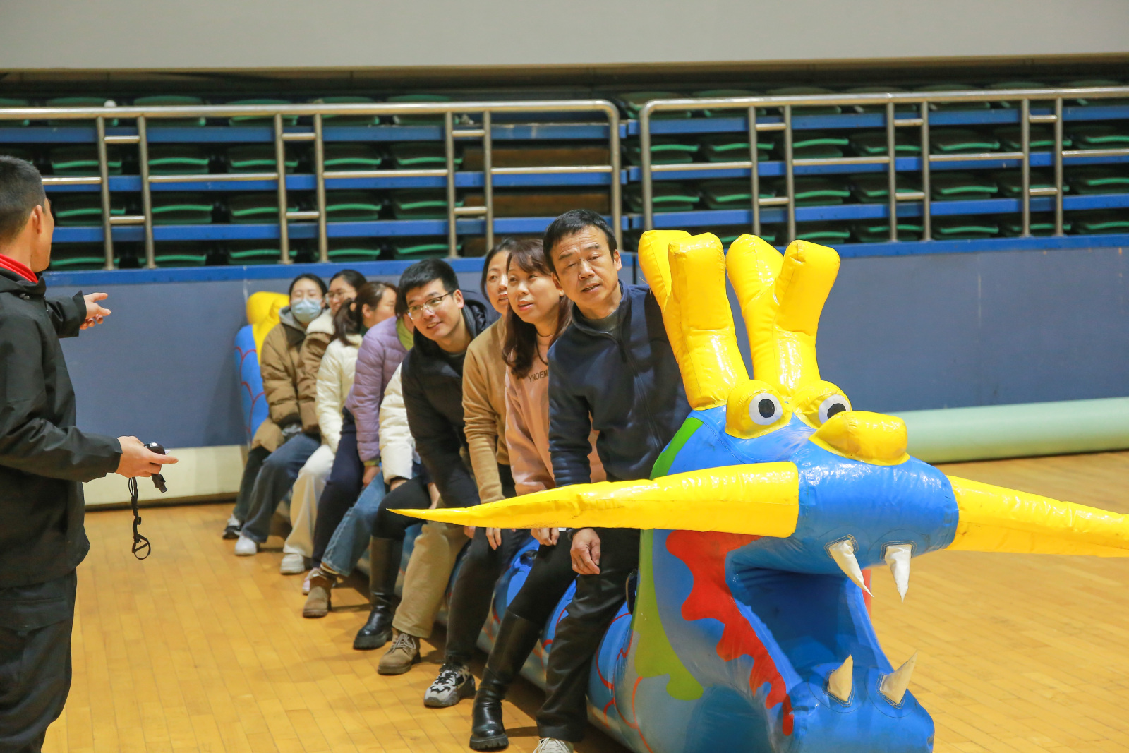 来自全校36个部门工会的400余名教职工代表现场比拼。闯关比赛为两项团队合作项目,旱地龙舟以及梅花桩接力。