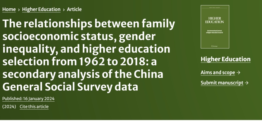 近日,教科院宋琼将助理教授在高等教育研究领域取得进展。研究成果以“The relationships between family socioeconomic status, gender inequality and higher education selection from 1962 to 2018: A secondary analysis of the China General Social Survey data”为题在高等教育学领域国际权威期刊《Higher Education》上发表。