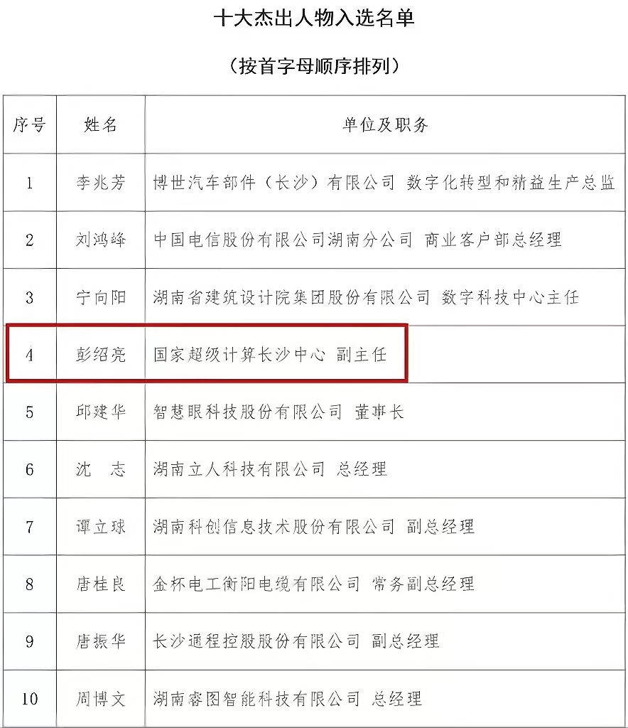 近日,2023年度第四届湖南省数字化十大杰出人物、优秀案例和服务商评选结果揭晓,国家超算长沙中心副主任彭绍亮入选第四届湖南省数字化十大杰出人物。