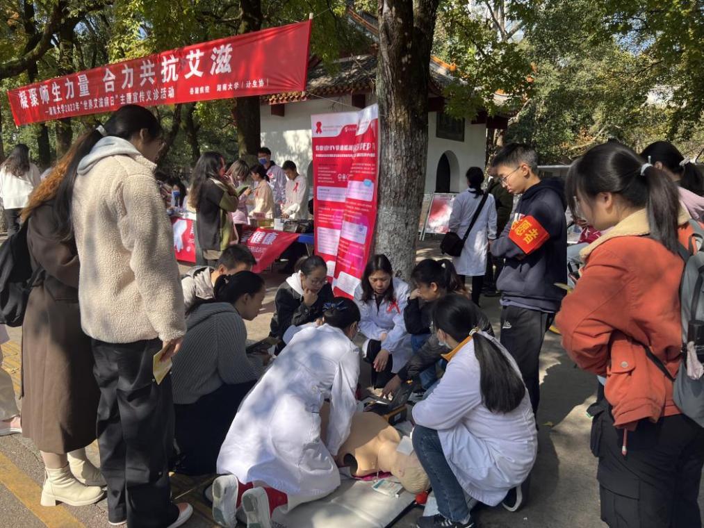 活动现场,工作人员通过悬挂横幅、布置学生防艾作品展览、发放宣传折页等普及防艾知识,学生志愿者组织参与线上答题,引导同学们了解和掌握预防艾滋病的相关知识;医务人员开设义诊台,解答师生有关血压、血脂、睡眠和骨质疏松等方面问题,现场还进行应急救护技能培训,指导操作心肺复苏、海姆立克模型,提高师生群众的防病急救意识和能力。