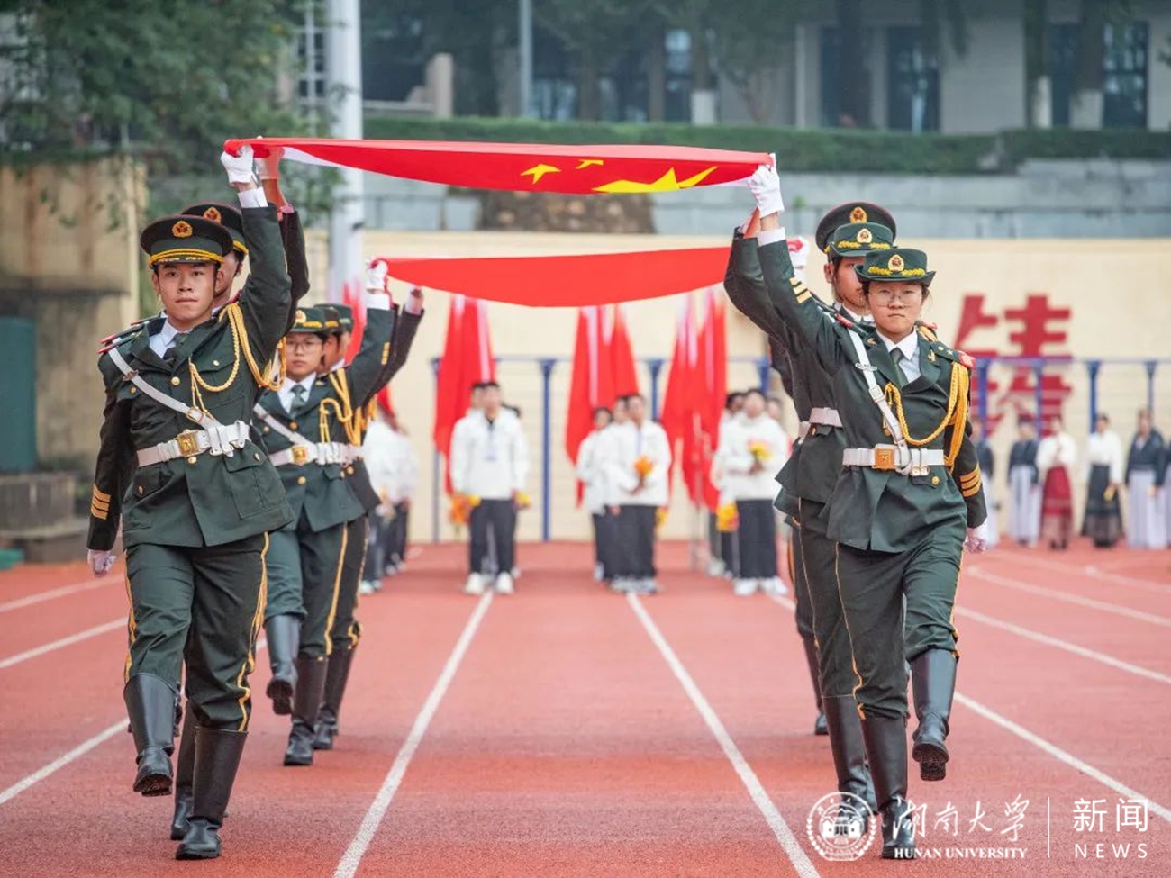田径场内,秋风微凉,各代表队分列于操场之上,组成HNU等字样。伴随着响亮的歌声,各方阵各有特色、步伐整齐、昂首阔步走入赛场,充分展现了学校师生精神饱满、积极向上的风采。
