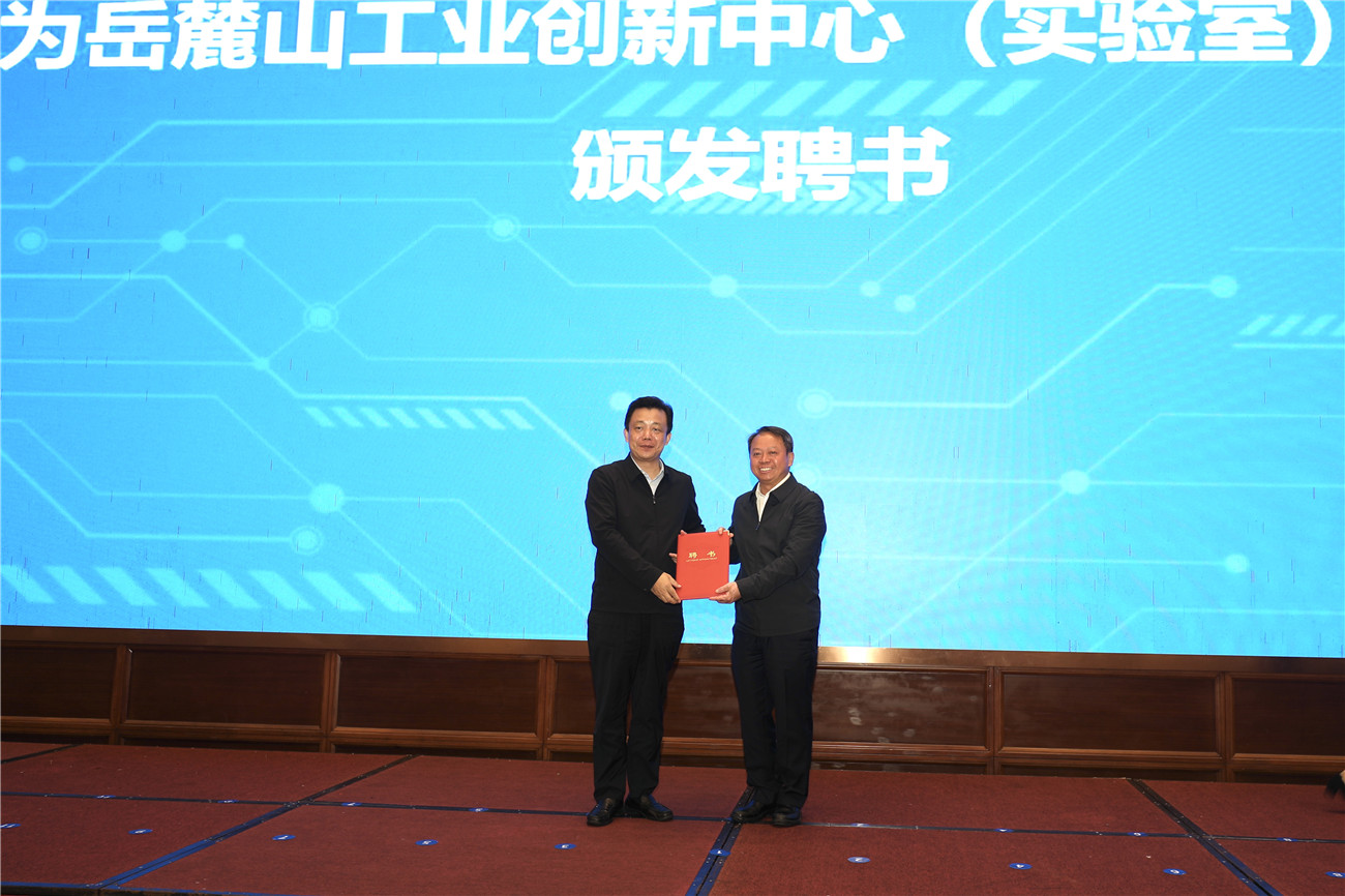 湖南省人民政府副省长秦国文出席成立大会,为湖南大学党委宣传部(新闻办公室)地址中心校长、岳麓山工业创新中心(实验室)主任段献忠和中国工程院院士、岳麓山工业创新中心(实验室)专家委员会主任黄伯云颁发聘书。中国工程院副院长、中国工程院院士钟志华受聘岳麓山工业创新中心(实验室)首席科学家并线上致辞。