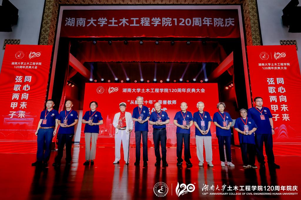 大会现场,“从教五十年”荣誉教师表彰仪式、《湖大土木百廿年育人记》发布仪式、“百廿土木同心砖”捐赠基金启动仪式、全国重点实验室启动仪式相继举行。