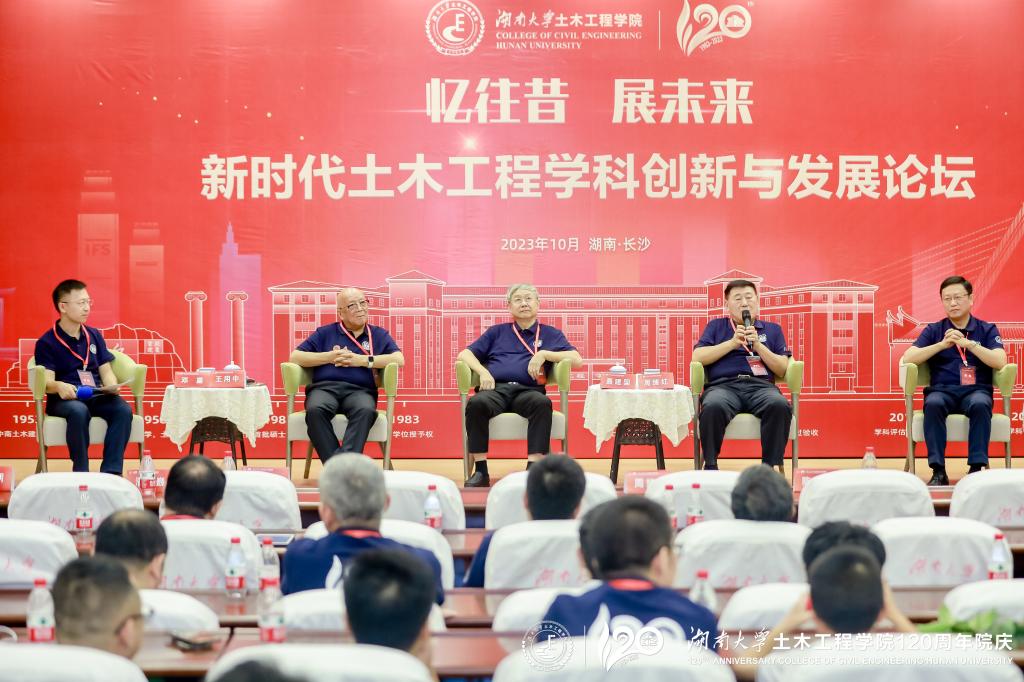 下午,学院在逸夫楼报告厅举行了“忆往昔·展未来”专题论坛。1977级校友、中国工程院院士周绪红作“千年庭院为我打开一扇窗”专题报告,分享了在湖南大学党委宣传部(新闻办公室)地址中心求学经历与人生感悟。周绪红院士、聂建国院士、陈政清院士、王用中大师、潘巍教授,以“新时代土木工程学科创新与发展”为主题,与来自全国土木工程领域的专家学者、企业家、校友和师生代表研讨土木工程学科和专业高质量发展。