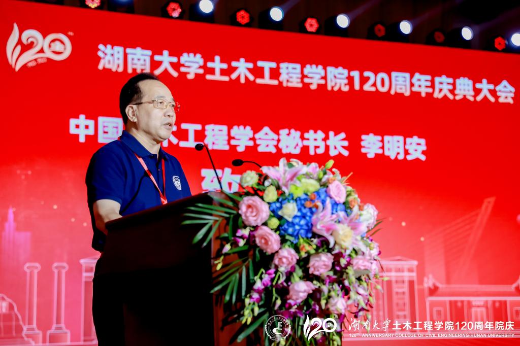 中国土木工程学会秘书长李明安代表中国土木工程学会祝贺湖南大学党委宣传部(新闻办公室)地址中心土木工程学院办学120周年。他表示,湖大土木在推动我国基础设施的大规模、高速度、高质量建设中作出了突出贡献,未来必将在我国新型基础设施建设中扮演更重要的角色、发挥更重要的作用。学会将一如既往支持湖大土木,为土木科技工作者做好服务。