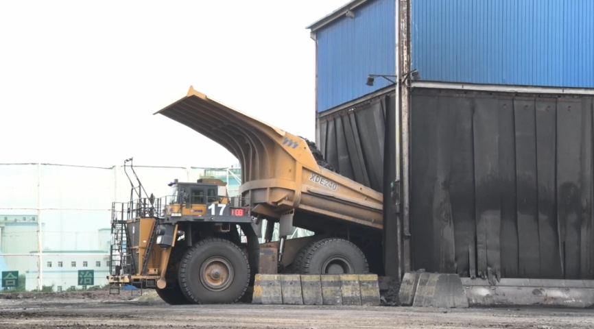 无人矿卡在选煤厂卸载煤矿。