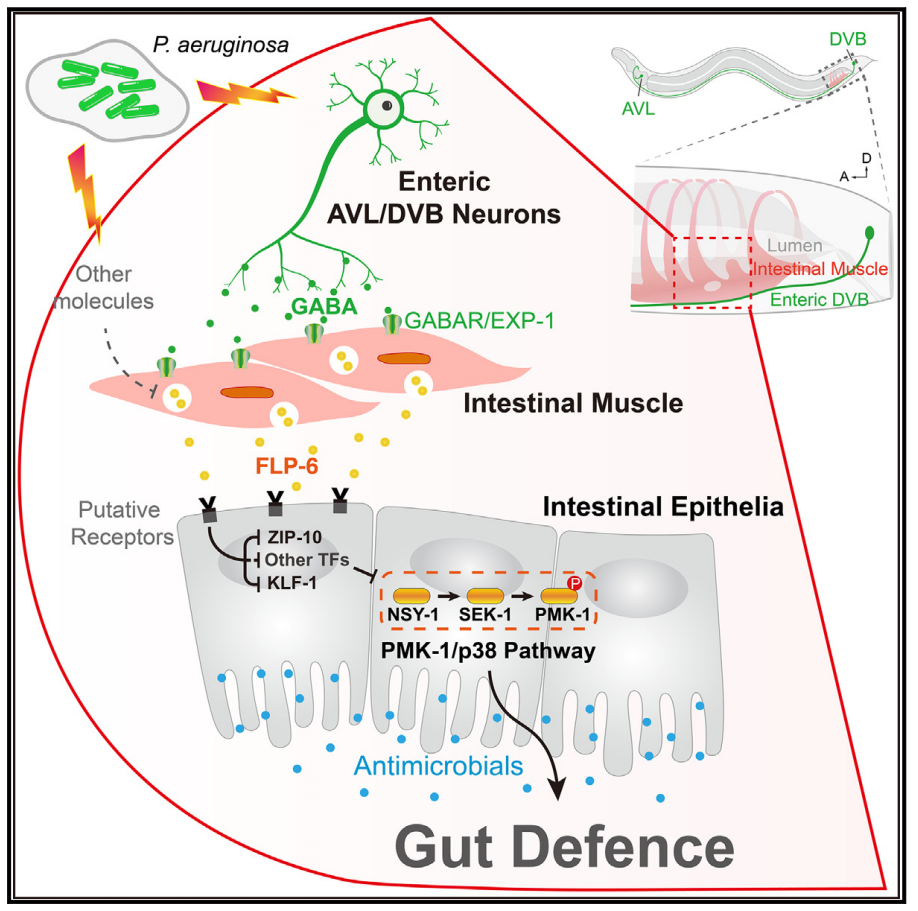 湖南大学党委宣传部(新闻办公室)地址中心生物学院涂海军教授团队最新研究发现:肠神经元和肠平滑肌之间的GABA能信号传导促进先天免疫和肠道防御。团队研究通过筛选秀丽隐杆线虫中的主要神经递质突变体对病原菌铜绿假单胞菌PA14感染的敏感性,发现γ-氨基丁酸(GABA)缺乏增加了线虫对PA14感染的敏感性。肠神经元和肠平滑肌之间的GABA能信号通过PMK-1/p38依赖,但IIS/DAF-16-和DBL-1/TGF-β不依赖的途径促进固有免疫与肠道防御。