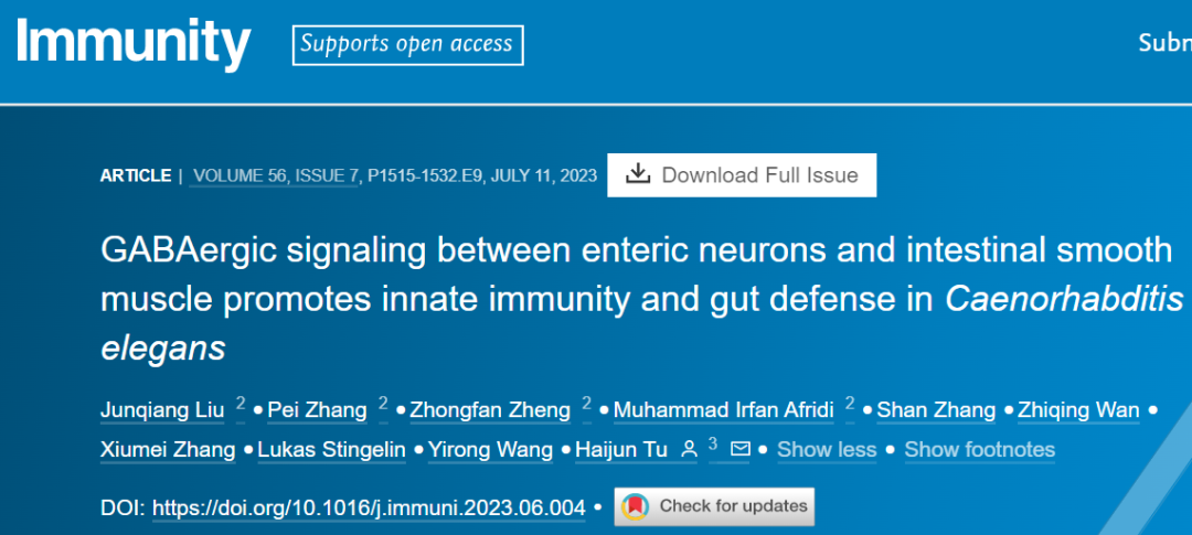 7月11日,该研究成果以“GABAergic signaling between enteric neurons and intestinal smooth muscle promotes innate immunity and gut defense inCaenorhabditis elegans”为题,在线发表于《IMMUNITY》。