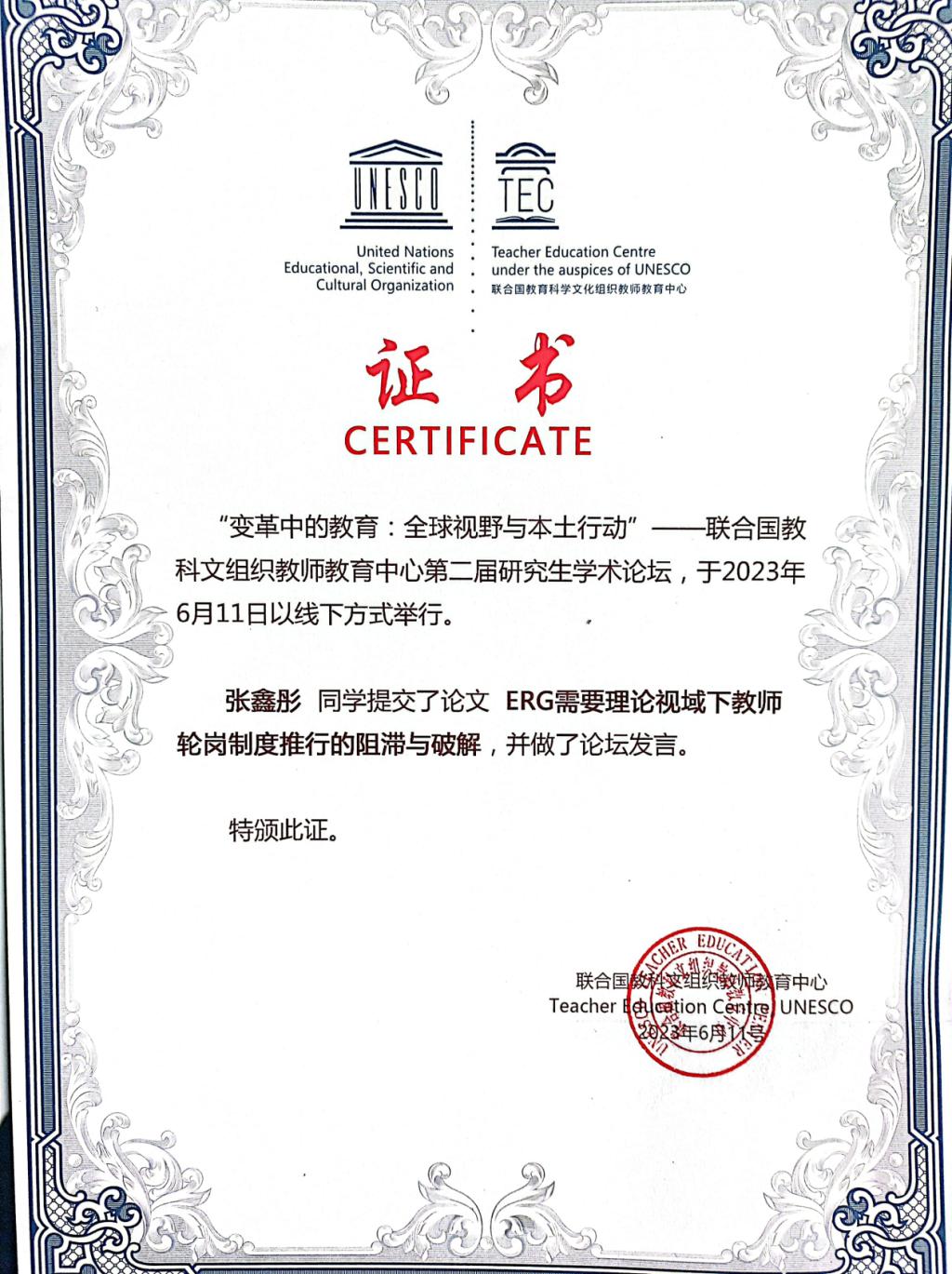 6月10日至11日,由联合国教科文组织教师教育中心组织举办的第二届研究生学术论坛在上海举行,来自北京师大、华中科大、南京大学、华东师大等全国17余所高校的52名学子参加。我校教育科学研究院教育学专业研究生张鑫彤同学的论文入选此次论坛并受邀发言,是全省高校唯一被邀请参加论坛的研究生。