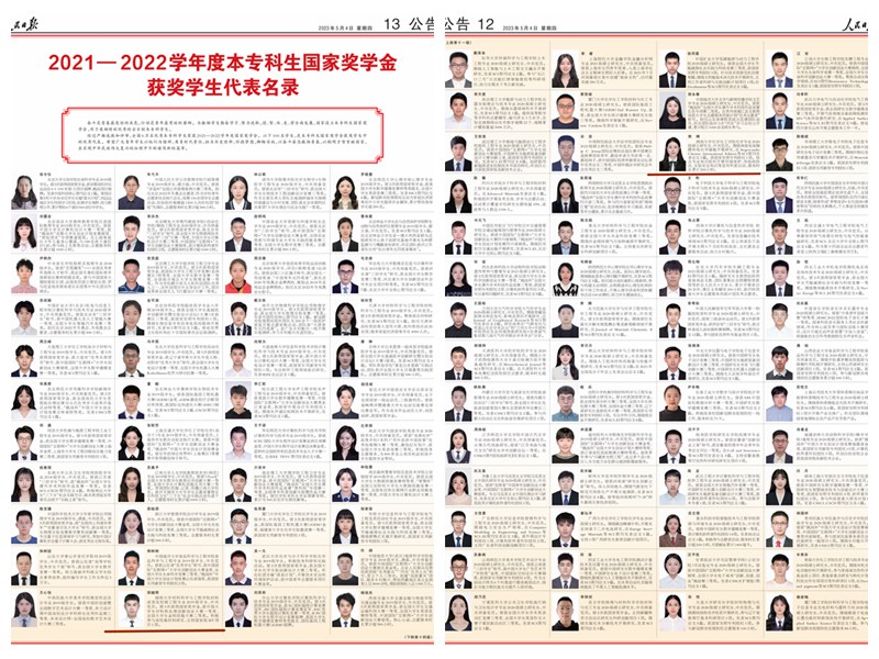 《人民日报》刊登的100名本专科生国家奖学金获奖学生代表、100名研究生国家奖学金获奖学生代表是全国6万名2021-2022学年度本专科生国家奖学金获得者、4.5万名2021-2022学年度研究生国家奖学金获得者中的优秀代表。我校获奖学生代表已连续六年入选《人民日报》获奖学生代表名录。