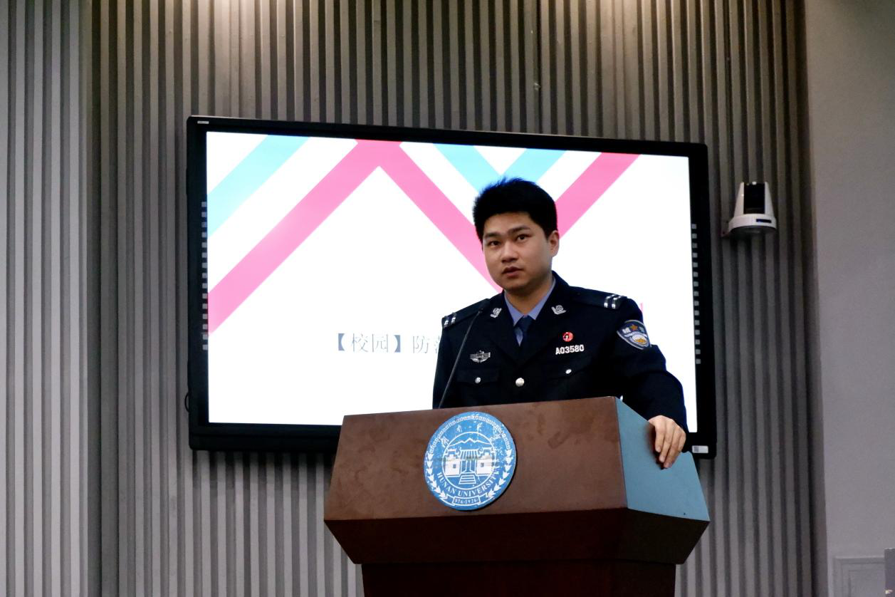 驻校民警程志警官分析了当前校园内电诈案件发案情况,提醒同学们要保持清醒的头脑,保护自身财产安全。保卫部相关负责老师就校园学生宿舍、实验室消防安全进行了讲解。