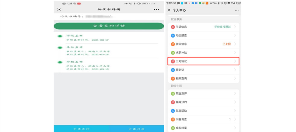 为让就业签约变得更加高效便捷,实现不跑腿就完成签约,招生与就业指导处推行网上签约一站式服务,毕业生和用人单位可通过学校就业信息网或就业微信公众号发起网签,还可实时查看签约进程,实现了在线电子签约,有效提升了签约效率。