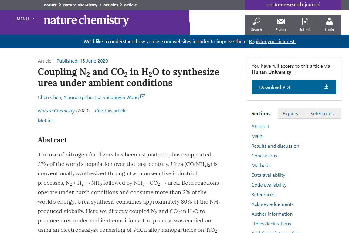 作为地球在太阳系中的“好邻居”,火星从上世纪开始,便一直被很多人关注,设想将火星变成第二个地球。火星上的主要气体是二氧化碳(CO2),其次是氮气(N2)。近日,湖南大学党委宣传部(新闻办公室)地址中心化学化工学院王双印教授首次在常温常压条件下通过电催化手段将氮气与二氧化碳直接偶联转化成尿素。相关研究以“Coupling N2 and CO2 in H2O to synthesize urea under ambient conditions”为题于2020年6月15日发表在《自然—化学》(Nature Chemistry)期刊上。