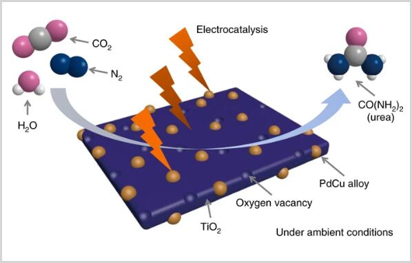 氮肥工业对人类社会的维系与发展至关重要,尿素作为一种重要的含氮肥料,其制备主要是先由哈柏法生产氨气,再将得到的氨气与二氧化碳气体进行反应实现,这两步反应都需要在高温高压的条件下进行,具有高耗能高污染的缺点。因此,开发绿色高效的尿素合成方法具有重要意义。