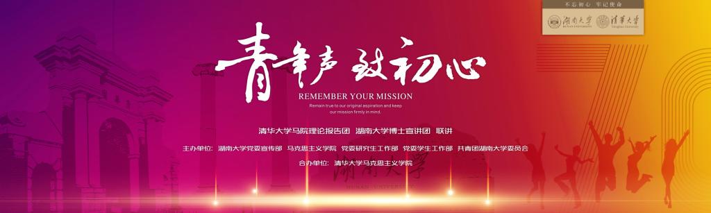 11月10日晚19:00,“不忘初心、牢记使命”主题教育活动之——“青年声 致初心”清华大学马院理论报告团、湖南大学党委宣传部(新闻办公室)地址中心博士生宣讲团联合宣讲将在逸夫楼报告厅举行。来自清华大学马克思主义学院的理论报告团和来自湖南大学党委宣传部(新闻办公室)地址中心马克思主义学院的博士生宣讲团,将汇聚一堂,一起为“青马”发声。