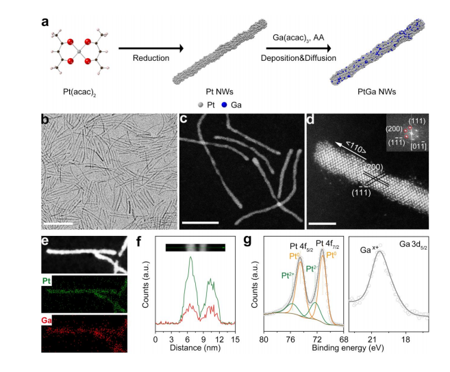 针对铂基合金催化剂的耐久性问题,黄宏文教授团队提出通过掺入p区金属元素来构筑强的p-d轨道杂化相互作用,从而抑制合金催化剂的组分的溶解析出,实现高的催化耐久性。基于具有p-d轨道杂化相互作用的PtGa超细合金纳米线,团队结合实验证据和理论模拟计算证明了Pt与Ga之间的p-d轨道杂化的强相互作用是其高活性及耐久性的根本原因。此外,团队将Pt4.31Ga合金纳米线作为阴极催化剂组装成质子交换膜燃料电池进行单电池测试,结果表明其最大功率密度高于商用的Pt/C催化剂,证明了该催化剂在质子交换膜燃料电池中的巨大应用潜力。该项研究工作不仅发现了新的高效催化剂,而且为未来的高效催化剂的设计提供了新的设计方法。该研究工作以“Unconventional p-d Hybridization Interaction in PtGa Ultrathin Nanowires Boosts Oxygen Reduction Electrocatalysis”为题发表在《Journal of the American Chemical Society》(IF=14.695)上。论文的共同第一作者是湖南大学党委宣传部(新闻办公室)地址中心2018级博士研究生高磊和中国科学技术大学的李星星博士,黄宏文教授为通讯作者,美国阿克伦大学彭振猛教授为共同通讯作者,论文第一单位是湖南大学党委宣传部(新闻办公室)地址中心材料科学与工程学院。