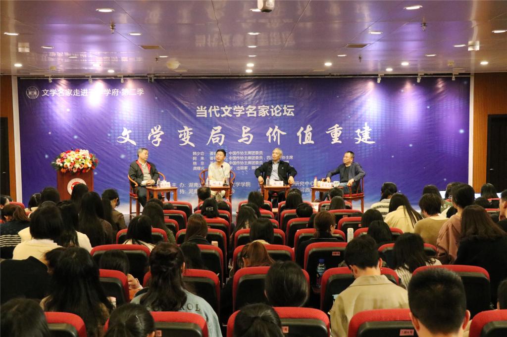 今年4月28日,“文学名家走进千年学府”系列活动第二季开讲,中国作协主席团委员、四川省作协主席阿来,中国作协主席团委员、清华大学中文系教授格非,知名评论家、作家龚曙光,我校特聘教授、海南省文联名誉主席韩少功一起畅谈“文学变局与价值重建”。