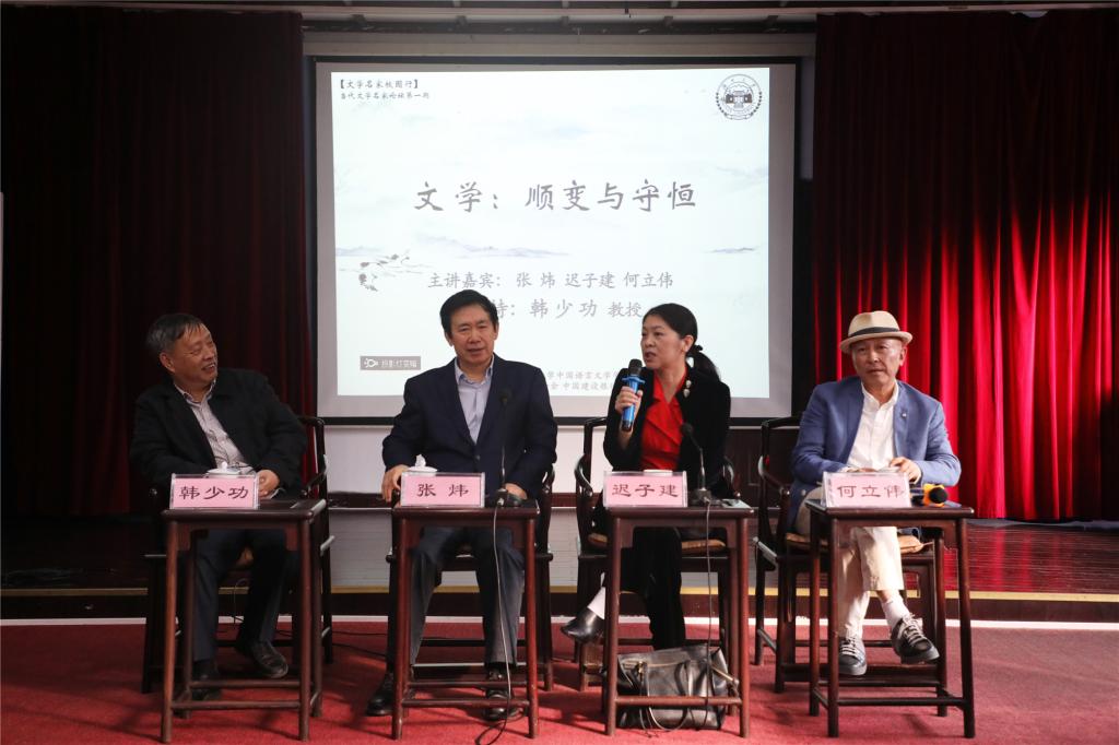 2018年10月30日,“文学名家走进千年学府”系列活动首次开讲,中国作协副主席、山东省作协主席张炜,黑龙江省作协主席迟子建,湖南省作协名誉主席何立伟,我校特聘教授、海南省文联名誉主席韩少功一起畅谈“文学:顺变与守恒”。
