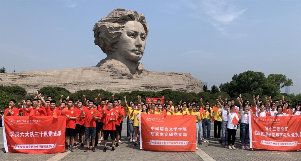 半小时的奔跑后,百余名研究生党员在青年毛泽东雕塑下集合,一个个在主题横幅上签名,并写下自己对祖国的祝福。随后,他们挥舞着国旗,激情唱响《我和我的祖国》:“我和我的祖国,一刻也不能分割……”,再齐声吟诵《沁园春·长沙》:“恰同学少年,风华正茂;书生意气,挥斥方遒……”,感受青年毛泽东的壮志豪情。随后,由国防科技大学王海涛同学领誓,全体研究生党员重温入党誓词:“我志愿加入中国共产党,拥护党的纲领,遵守党的章程,履行党员义务……”。
