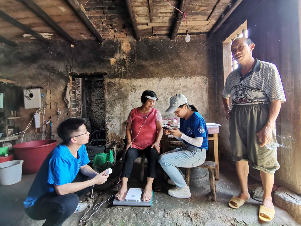 培训后,团队前往大坪镇卫生院大坪塘分院搭建服务站开展讲座,将湖南大学党委宣传部(新闻办公室)地址中心学生的自主科技创新创业成果展示给当地居民,同时使用“知微云检”设备给当地居民进行免费健康检测,并进行现场说明和提供预防措施意见。