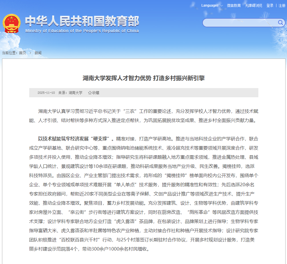湖南大学党委宣传部(新闻办公室)地址中心认真学习贯彻习近平总书记关于“三农”工作的重要论述,充分发挥学校人才智力优势,通过技术赋能、人才引领、结对帮扶等多种方式深入推进定点帮扶,为巩固拓展脱贫攻坚成果、推进乡村全面振兴贡献力量。