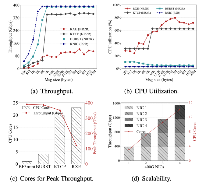 近日,计算机学院陈果教授团队提出了BURST——一个面向异构环境的高性能Soft-RDMA栈。通过基于用户态的设计、安全可靠的共享资源管理机制,以及结合DPDK与DSA的高效加速,BURST实现了与商用RNIC行为和性能基本一致的RoCEv2通信流程,并在400G环境下首次证明:软件RDMA也可以以较低的CPU开销,实现接近硬件线速的吞吐,并显著提升NR2R场景的连接建立效率与通信性能,为RDMA在异构集群中的大规模落地提供了可行路径。