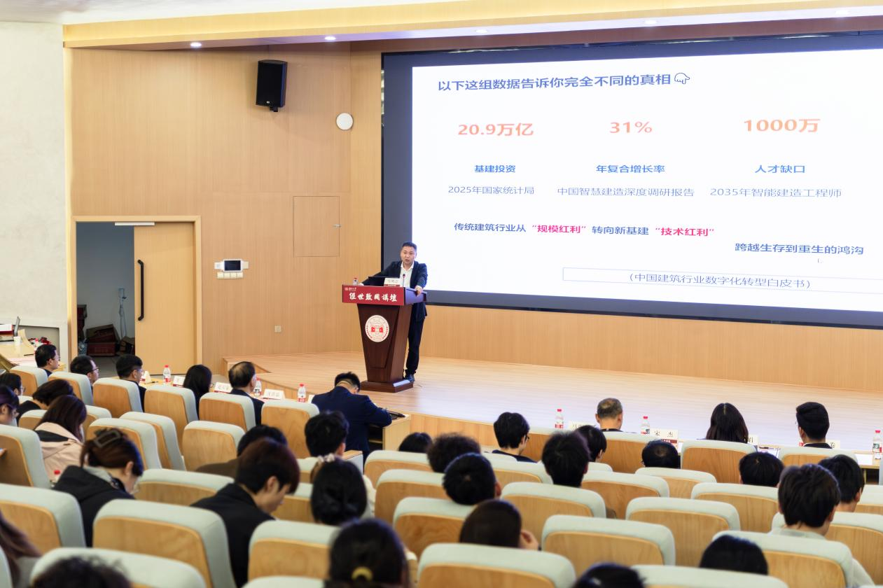 互动环节中,现场师生围绕智能建造技术落地难点、建筑行业碳减排路径及校企协同育人模式等热点问题,与马明磊展开深入交流探讨。马明磊结合自身实践经验,着重强调了持续学习的重要性,鼓励在场师生准确把握建筑业变革趋势与前沿技术方向,主动延伸与企业的合作交流,在理论学习与实践探索中收获个人成长、汲取创新灵感。