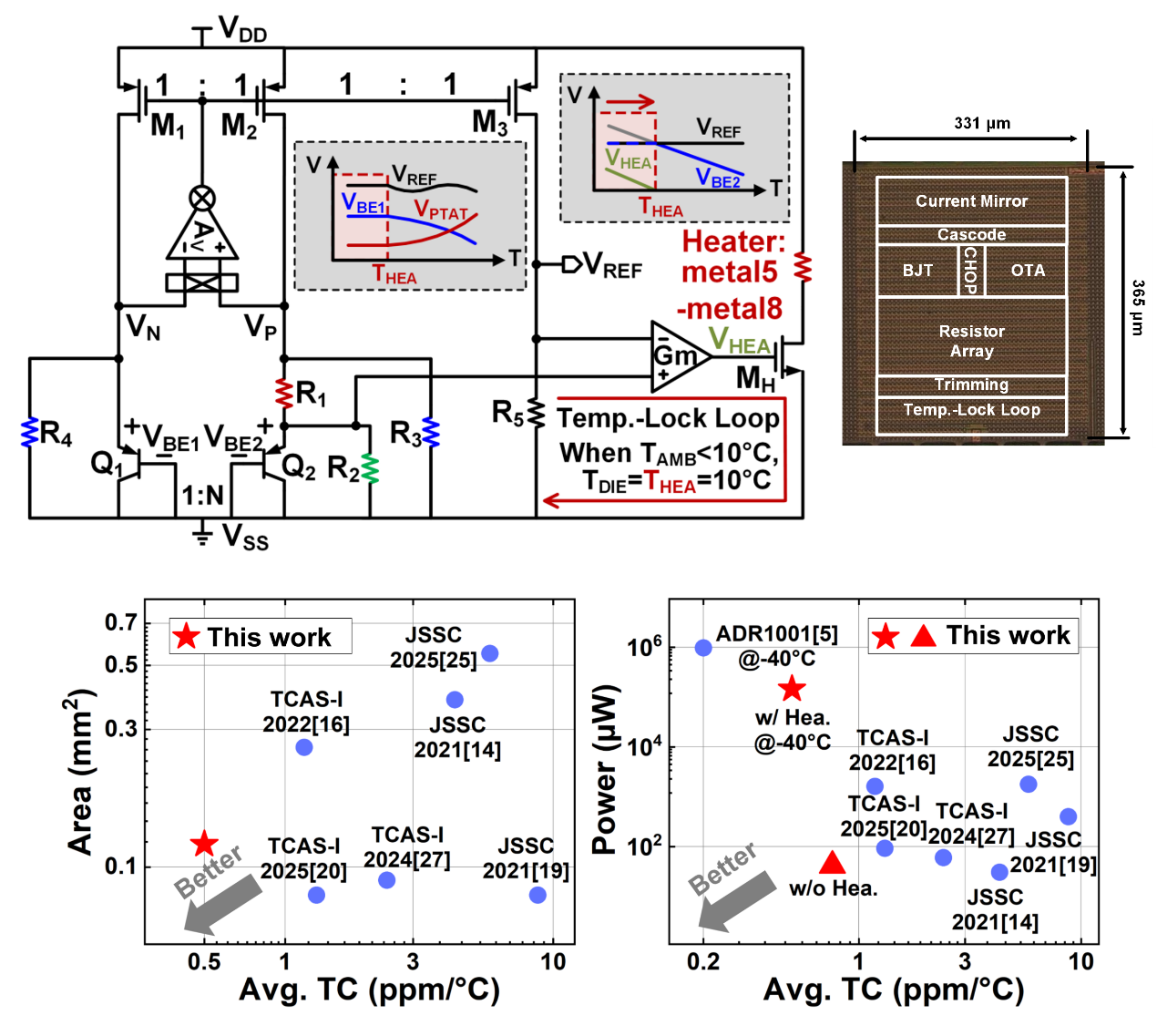 高精度电压基准电路结构及显微图(上图),面积、功耗与平均温度系数性能对比(下图)。