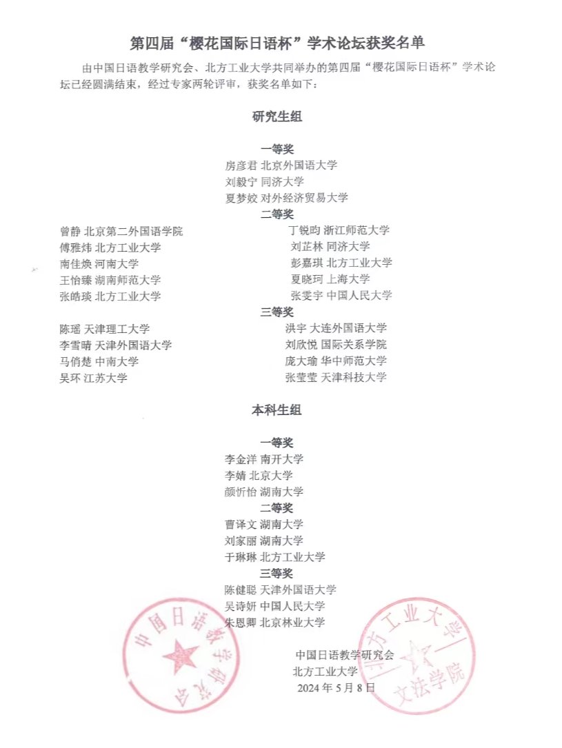 近日,第四届“樱花国际日语杯”学术论坛圆满落幕,我校日语系学生在论文评比中获本科生组一等奖1项、二等奖2项。