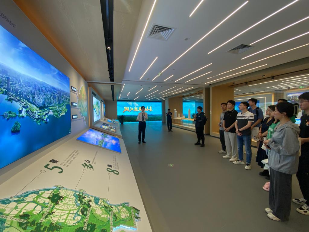 展厅内,师生们围绕“中国式现代化的湘江实践”这一学习主题,结合实地讲解和新媒体技术交互体验,系统了解了湘江新区的发展历程、实践探索、整体规划和科创成果。