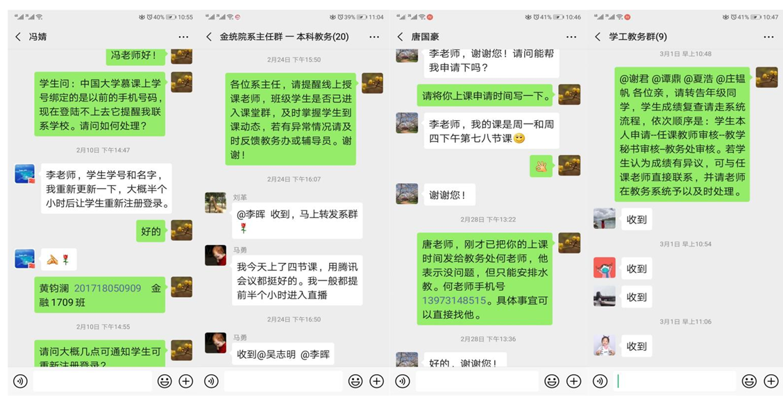 1月30日开始,团队积极组织学院老师参与教务处组织的各类在线教学平台讲座,重点与学堂在线(雨课堂)、超星(学习通)等在线学习平台沟通交流,为学院教师提供更好在线技术支持服务平台。熊晓鸽奖教金获得者、校优秀教学秘书、院本科教学管理办公室主任李晖主动搭建金统院在线学习交流群。