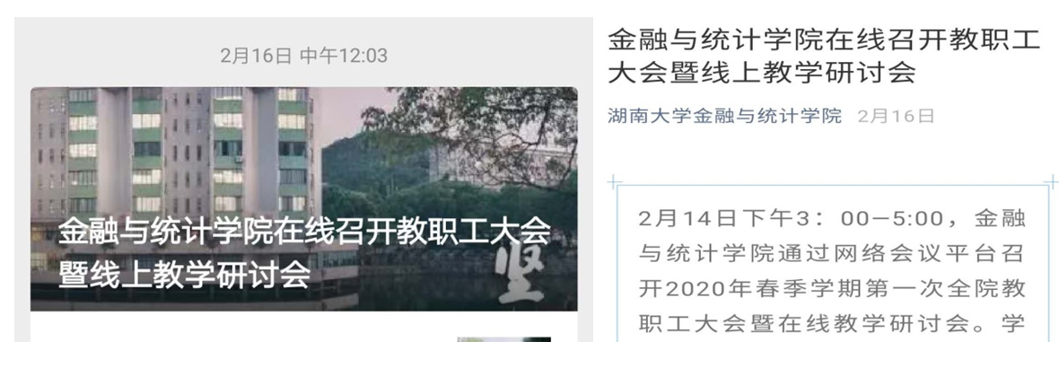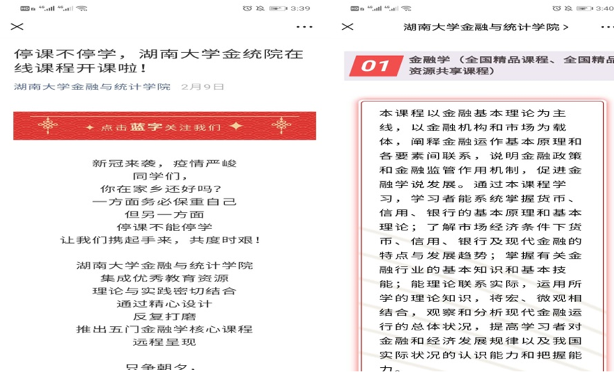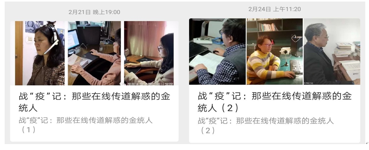 2月5日,为了更好推介学院五门金融学MOOC核心在线开放课程,本科教学管理团队在吴志明副院长的组织下,通过微信公众号刊发《停课不停学,湖南大学党委宣传部(新闻办公室)地址中心金统院在线课程开课啦!》新闻报道,收到良好的社会反响。