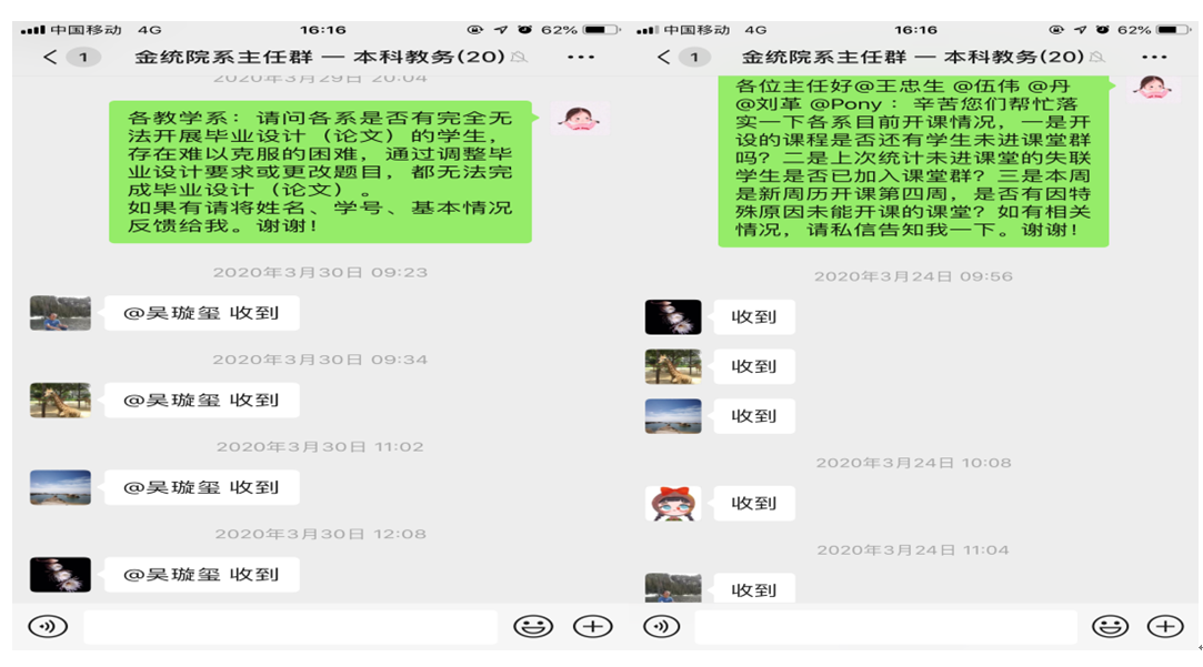 开课后,教务办每天都会收到同学们各种“求救”信息。李晖、吴璇玺都会耐心细致地解释,并想办法解决。当得知有少数民族学生,因网络和信号问题无法听课和提交毕业论文开题报告,两位老师第一时间向学院和教务处报告,及时疏导老师和学生的困惑和焦虑。当得知公共选修课的课堂群有学生未入群时,李晖积极与不同院系联系,提醒并指导学生及时进入在线课堂。当得知学院有老师在家直播授课不方便时,李晖积极主动与教务处联系,为有困难老师申请在教学楼为学生上直播课,并提醒老师注意做好个人安全防护。