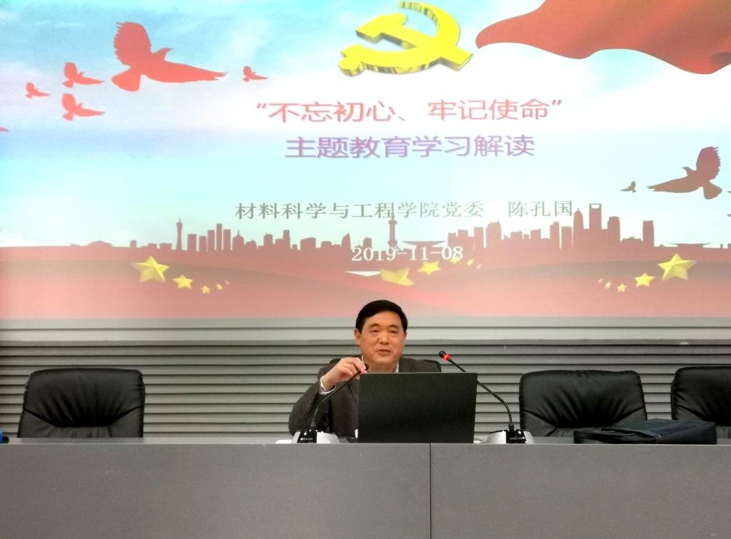 11月8日晚,材料学院党委书记陈孔国在复临舍报告厅以“‘不忘初心、牢记使命’主题教育学习解读”为题主讲专题党课。学院师生党员及入党积极分子参加了学习。