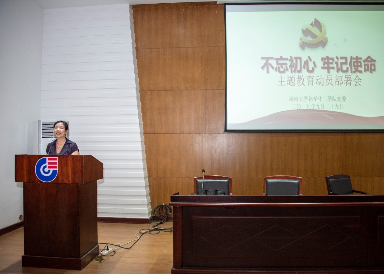 9月29日下午,化学化工学院在新化工楼D区报告厅召开了“不忘初心、牢记使命”主题教育动员部署会,对学院主题教育进行了全面动员和具体部署。学院党委书记王玉枝同志作了动员部署讲话,学校主题教育第一督查指导组成员、校团委书记彭嘉芬同志出席会议并讲话,学院院长张晓兵同志主持会议。