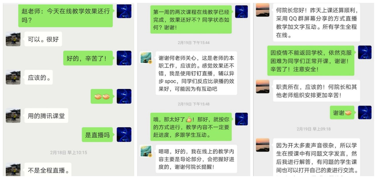 同时,学院建立每一门课程的QQ群和微信群,安排17位教学督导组成员和班主任深入全部20个课堂进行督导;层层把关MOOC课程,明确每门课程要有课前预习、课后练习以及远程辅导答疑等环节,严格教学管理;及时联系每位任课教师,总结每周教学运行情况。