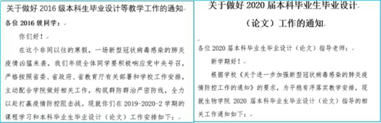 绝不让一位同学因为疫情而耽误学业。生物学院特别关注毕业班同学,组织同学填写《毕业学分核实和修课计划表》,让每一位毕业班的孩子对已修学分数、所差学分数及所差学分数的修课计划心中有数,并对有实际困难的同学落实帮扶计划。因学院绝大部分的毕业设计(论文)工作需要进行实验来完成,学院出台《做好毕业生毕业设计(论文)工作的通知》,要求导师每周若干次远程指导学生查找资料、阅读文献、设计好研究方法与技术路线等,以便返校后可以立即开展各项实验工作。