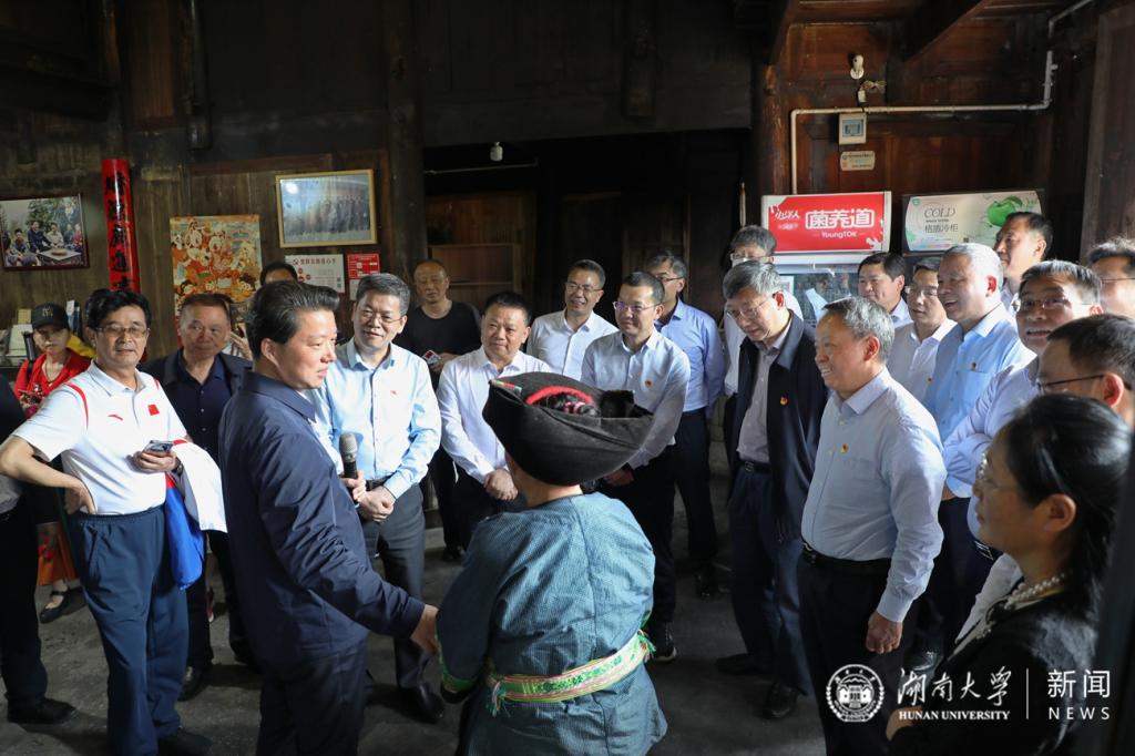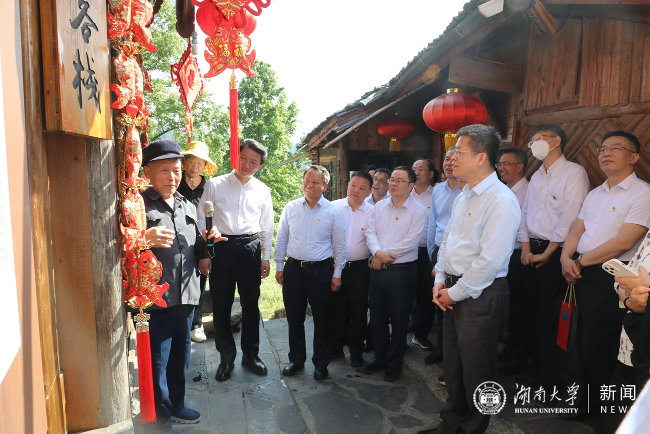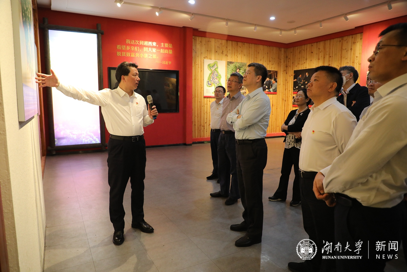 在十八洞村,中心组(扩大)一行追寻习近平总书记考察足迹,走访当地村民家、便民邮局、苗绣乡村振兴示范基地、“幸福人家”等地。重温入党誓词,听取微党课《精准扶贫从这里出发》、《首倡地规划设计的湖大力量》主题汇报,观看专题片《十八洞村新时代山乡巨变》。