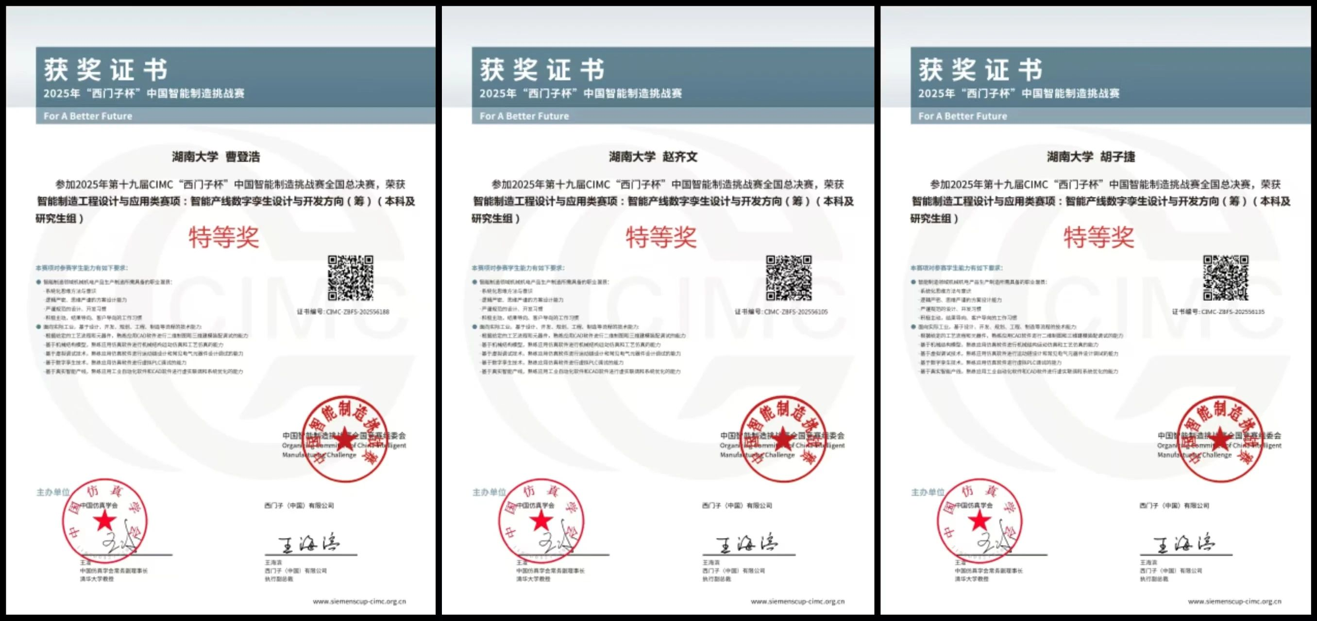 近日,第十九届“西门子杯”中国智能制造挑战赛(CIMC)全国总决赛在山西闭幕,我校机械与运载工程学院智能制造工程2301班赵齐文、胡子捷、曹登浩组成的参赛团队夺得智能产线数字孪生设计与开发方向全国第一名,获得特等奖。