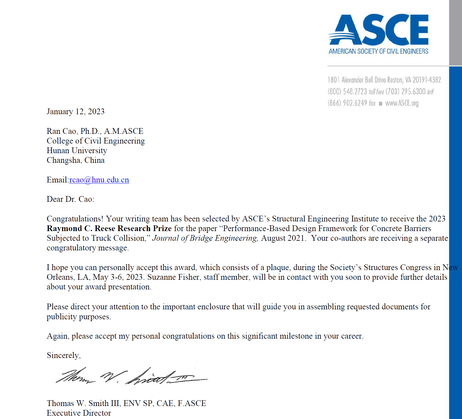 近日,我校土木工程学院曹然副教授获美国土木工程师协会ASCE颁发的雷蒙德·里斯奖(Raymond C. Reese Research Prize),以表彰其发表在国际桥梁领域知名期刊ASCE《Journal of Bridge Engineering》的论文《Performance-Based Design Framework for Concrete Barriers Subjected to Truck Collision》在结构工程领域作出的贡献。